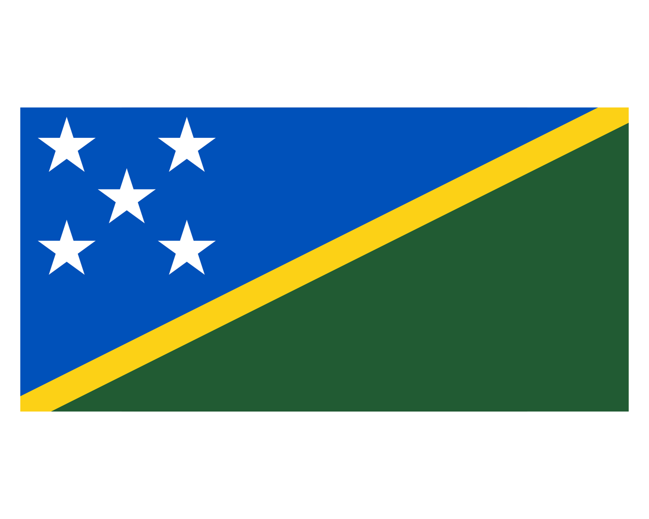 所羅門群島(英語:Solomon Islands),是南太平洋的一個島國,位于太平洋西南部,屬美拉尼西亞群島,首都霍尼亞拉。所羅門群島國旗呈橫長方形,長與寬之比為9:5。旗地由淺藍、綠色兩個三角形構(gòu)成。一道自左下角至右上角的黃色條帶將旗面分為兩部分。左上方為淺藍色三角形,內(nèi)有五顆等大的白色五角星;右下方為綠色三角形。淺藍色象征海洋和天空,黃色代表太陽,綠色象征該國的森林;五顆星代表組成這個島國的五個區(qū)域,即東、西、中央、馬萊塔和其他外圍島嶼。