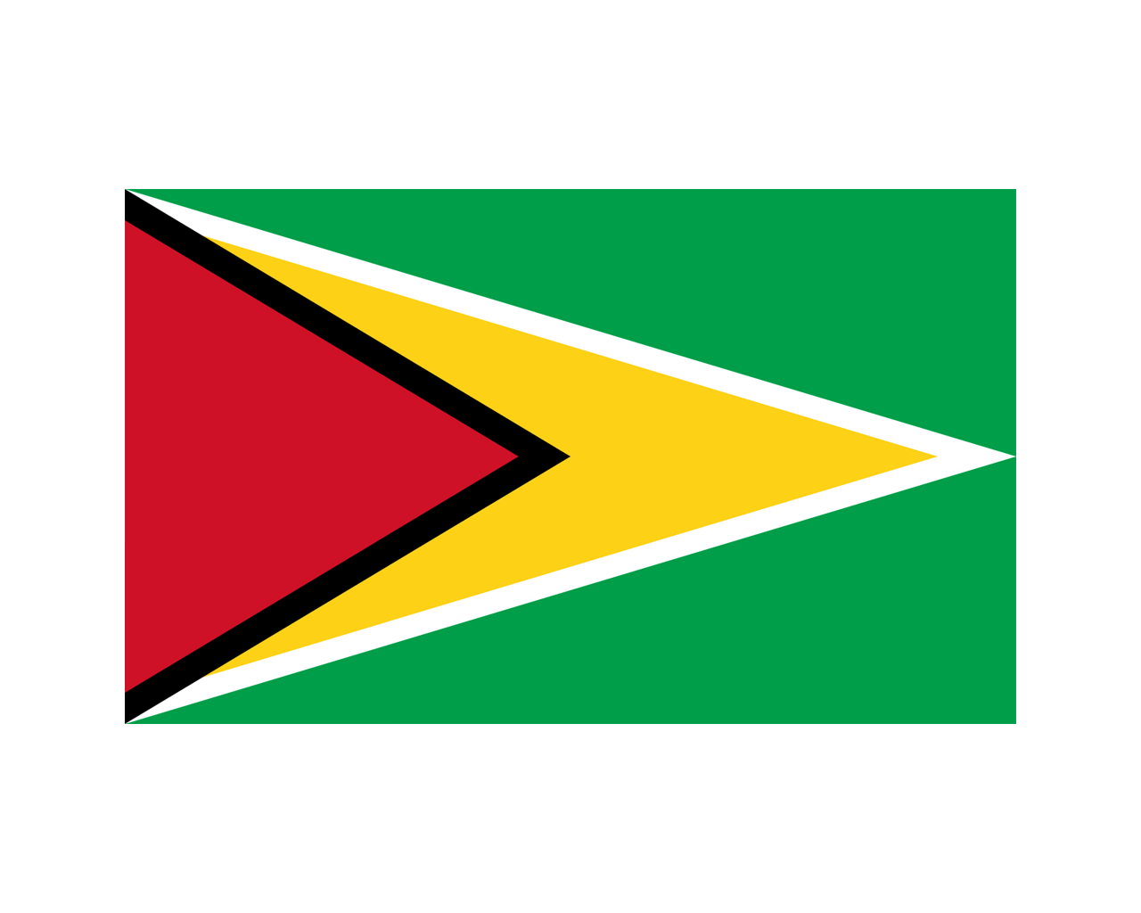 圭亞那合作共和國(Cooperative Republic of Guyana),簡稱圭亞那(Guyana,印第安語意為“多水之鄉”),位于南美洲北部,首都喬治敦。圭亞那國旗啟用于1966年5月26日,國旗呈長方形,長寬之比為5:3。帶白邊的黃色三角形箭頭在旗面上劃分出兩個相等對應的綠色三角形,三角形箭頭中套有一個帶黑邊的紅色等邊三角形。綠色代表該國的農業和林業等自然資源,白色象征河流和水源,黃色象征礦藏和財富,黑色象征人民勇往直前和堅韌不拔的精神,紅色象征人民建設祖國的熱情和力量,三角形箭頭象征國家前進的步伐。
