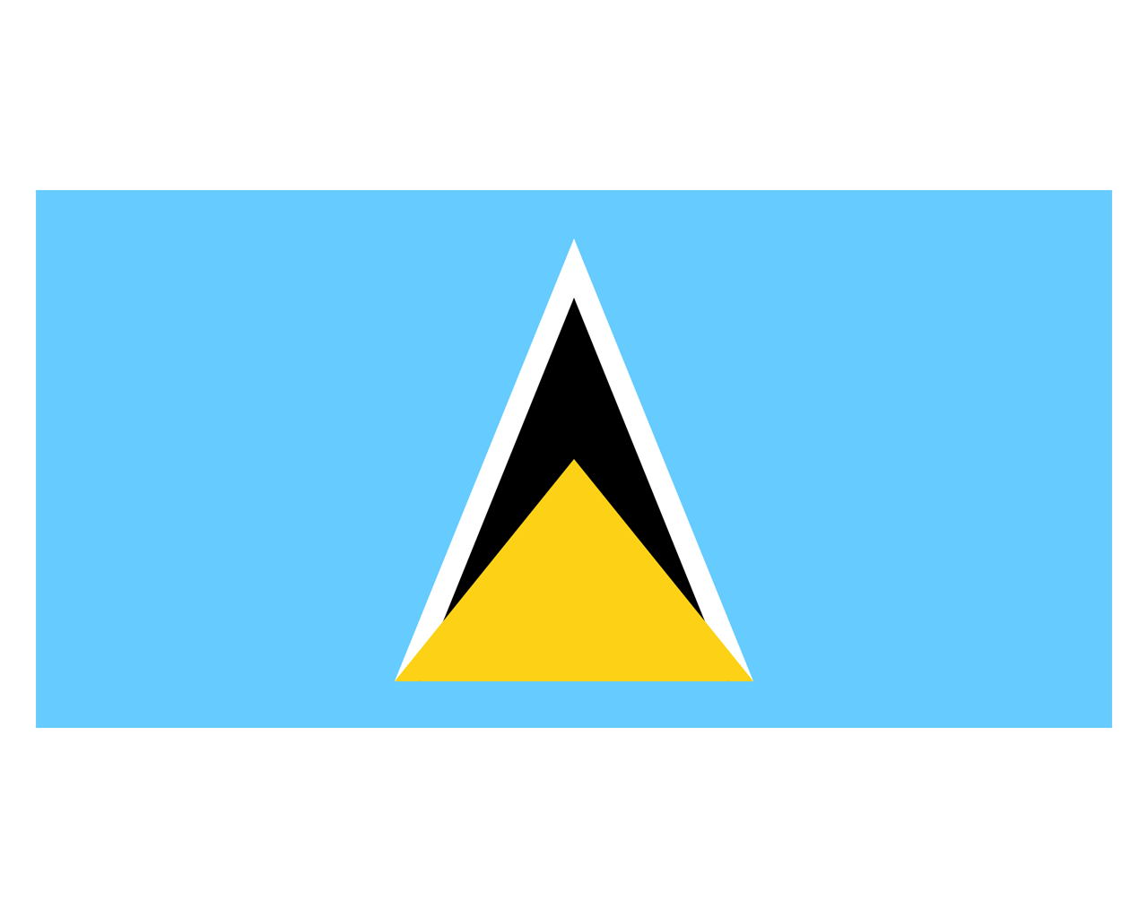 圣盧西亞(Saint Lucia),位于東加勒比海向風群島中部,是座火山島,英聯邦成員國,首都卡斯特里。圣盧西亞國旗啟用于1967年3月1日,2002年2月22日作出最新修改。國旗呈長方形,長寬之比為2:1。藍色旗面,中間的三角形圖案由白、黑、黃色圖形構成,為一個帶白邊的黑色箭頭和一個黃色等腰三角形。藍色代表圣盧西亞周圍的海洋、黑色代表火山,黑色和白邊又代表該國的兩個主要民族,黃色象征該島國的海灘和陽光。白、黑、黃三色構成的三角形,象征圣盧西亞這個島國。