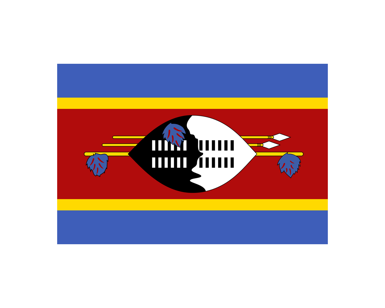 斯威士蘭王國(The Kingdom of Swaziland),簡稱斯威士蘭,是位于非洲東南部的內陸國家,北、西、南三面為南非所環抱,首都姆巴巴內。斯威士蘭國旗啟用于1968年,國旗呈長方形,長與寬之比為3∶2。旗面中間為紫紅色橫長方形,上下各有黃色窄邊和藍色寬邊。在紫紅色長方形中央繪有類似斯威士蘭國徽中盾牌的圖案。紫紅色象征歷史上無數次戰斗,黃色代表豐富的礦產資源,藍色象征和平。