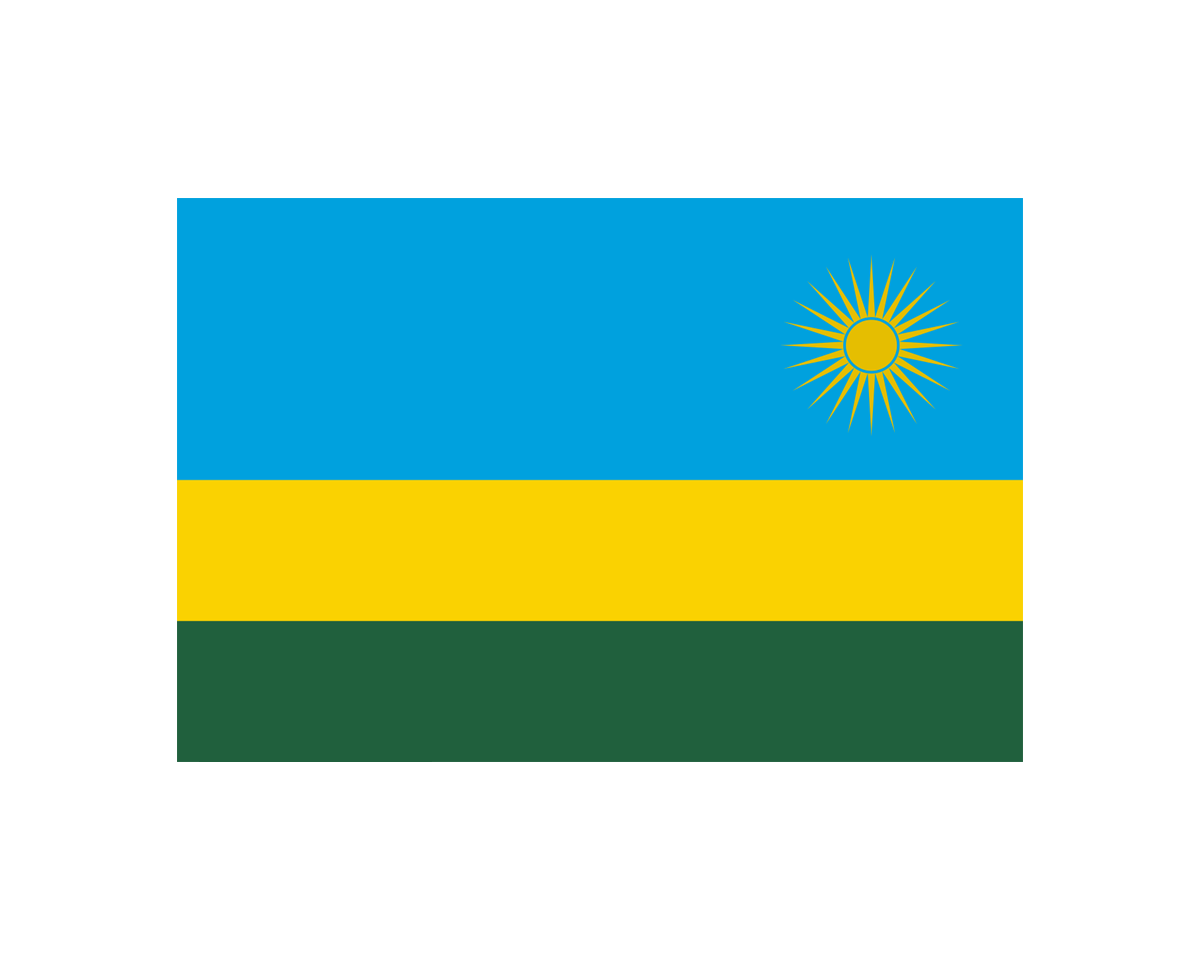 盧旺達(dá)共和國(Republic of Rwanda),是非洲中東部的一個(gè)主權(quán)國家。西面與剛果民主共和國(DRC)交界,東鄰坦桑尼亞,北與烏干達(dá)接壤,南連布隆迪,首都基加利。盧旺達(dá)國旗啟用于2001年10月25日,由一位工程師也是藝術(shù)家設(shè)計(jì)。國旗長(zhǎng)寬比例為3:2。國旗為藍(lán)黃綠三色旗。藍(lán)色代表人民必須為和平而戰(zhàn)方能使經(jīng)濟(jì)持續(xù)成長(zhǎng)并帶來快樂生活;黃色代表人民必須安居樂業(yè)以促進(jìn)永久的經(jīng)濟(jì)發(fā)展;綠色象征藉由人民合理的開發(fā)達(dá)到繁榮的希望,也象征國家的資源。右上方有一二十四道光芒的太陽標(biāo)志,二十四道光芒指引著全國人民,表示團(tuán)結(jié)一致、純真透明,與對(duì)抗無知的奮斗。