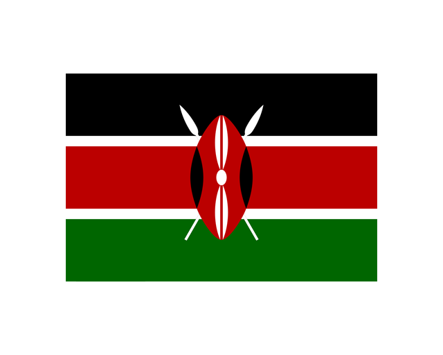 肯尼亞共和國(The Republic of Kenya)位于非洲東部,赤道橫貫中部,東非大裂谷縱貫南北,首都內羅畢,肯尼亞是人類發源地之一。肯尼亞國旗是根據獨立前肯尼亞非洲民族聯盟的旗幟為基礎而設計的。呈長方形,長與寬之比為3:2。自上而下由黑、紅、綠三個平行相等的橫長方形構成,紅色長方形上下各有一白邊。旗面中間的圖案為一面盾和兩支交叉著的長矛。黑色象征肯尼亞人民,紅色象征為自由而斗爭,綠色象征農業和自然資源,白色象征統一與和平;矛和盾圖案象征祖國統一和為捍衛自由而斗爭。