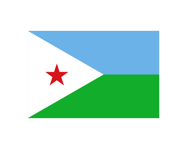 吉布提共和國(The Republic of Djibouti),簡稱吉布提,地處非洲東北部亞丁灣西岸,首都吉布提市。吉布提國旗呈長方形,長與寬之比約為9∶5。靠旗桿一側為一個白色等邊三角形,邊長與旗寬相等;右側為兩個相等的直角梯形,上方為天藍色,下方為綠色。白色三角形正中有一顆紅色五角星。天藍色代表海洋和天空,綠色象征土地和希望,白色象征和平,紅五角星代表人民的希望和斗爭的方向。整個國旗圖案的中心思想是“團結、平等、和平”。
