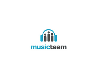 MUSICTEAM音樂團隊標志,音樂標志與耳機和一群人。設計的垂直線也代表音頻電平。