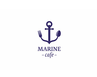 MARINE海洋咖啡館標志設計,該使用勺子、叉子、錨組合而成的圖形作為該標志的主識別圖案。