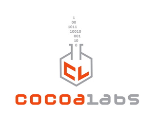 Cocoa實驗室標志設計使用試管和字符“0”、“1”的創意結合,整體富有科技感,以橙色和灰色為主色調。