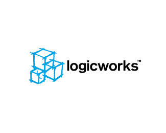 logicworks網站標志的主識別圖形使用手繪風格的立方體結構構成,以藍色作為主識別色。