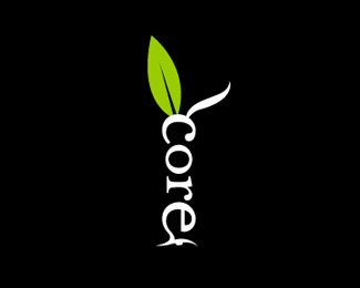 Core Cider蘋果酒標志設計欣賞,使用蘋果葉子作為該標志的主識別元素,以豎形排版方式,應用于酒類相關的創意標志設計,以綠色為主識別色。