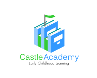Castle Academy青山學院標志設計欣賞,使用書本疊成建筑的形狀,應用于學校的標志設計,整體以綠色和藍色組合作為識別色。