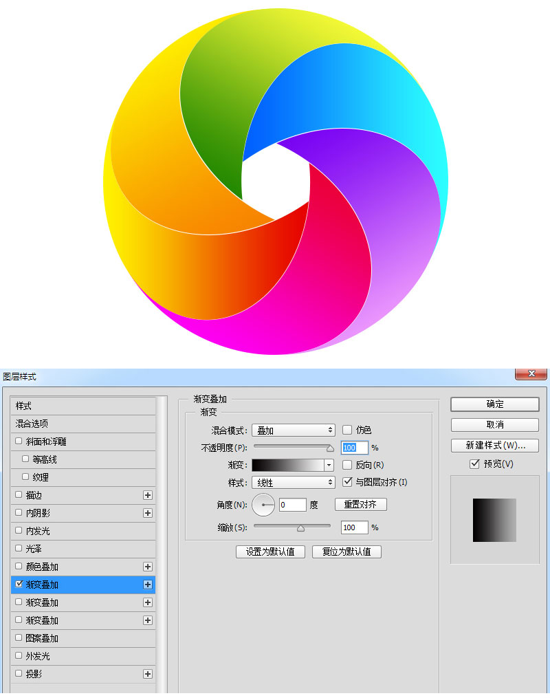 11、把每一層換成想要的顏色,分別添加一個(gè)漸變疊加樣式,混合模式疊加,每個(gè)圖層的漸變角度都要調(diào)整,每個(gè)角度都加60度。(如圖)