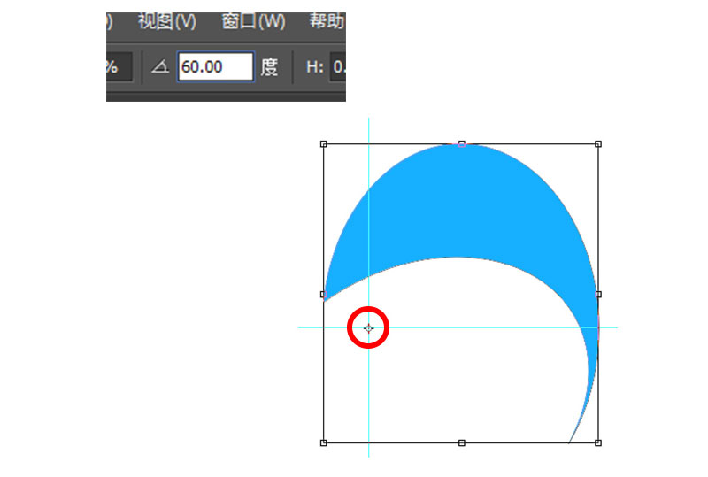 9、復(fù)制一個(gè)月牙層,CTRL+T,調(diào)整中心點(diǎn)到輔助線交叉點(diǎn)。角度變?yōu)?0度。(如圖)