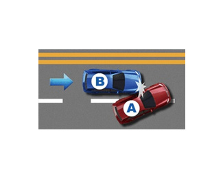 發生如上圖變更車道事故責任認定時,A車全責,變更車道與正常車道行駛的車輛發生事故,要負全部責任。
