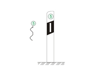 百米牌為圓形,直徑一般為10 cm,綠底白字,百米數(shù)字字高5 cm,公里數(shù)高1. 8 cm。設(shè)在高速公路或城市快速路兩側(cè)各里程牌之間,每隔100 m設(shè)一塊。百米牌可附設(shè)于兩側(cè)的柱式輪廓標(biāo)上;也可附設(shè)在波形梁護(hù)欄等設(shè)施上。