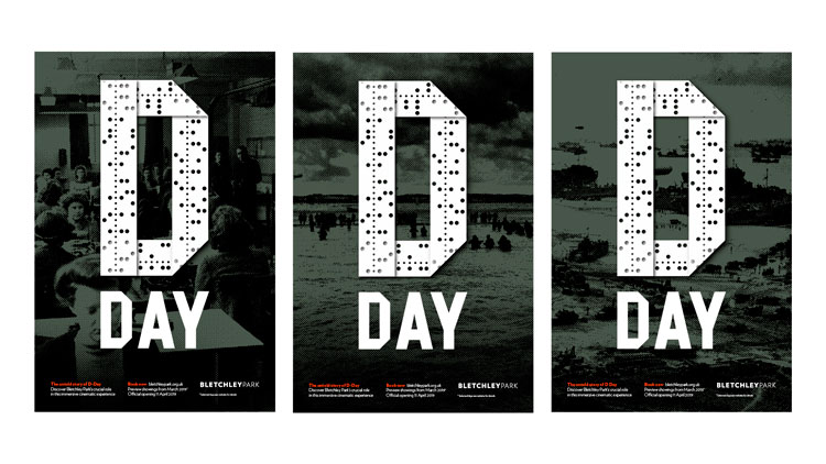 另一個微妙之處是展覽的三個主要部分攔截,情報和入侵已印在股票代號“D”的紙帶上在代碼中象征。點狀的紙帶圖案被用在新身份的所有觸點上,比如書簽等文具上,以及現在坐落在布萊切利公園(Bletchley Park)電傳打字機大樓外的一個新的永久性鋼鐵紀念碑上。