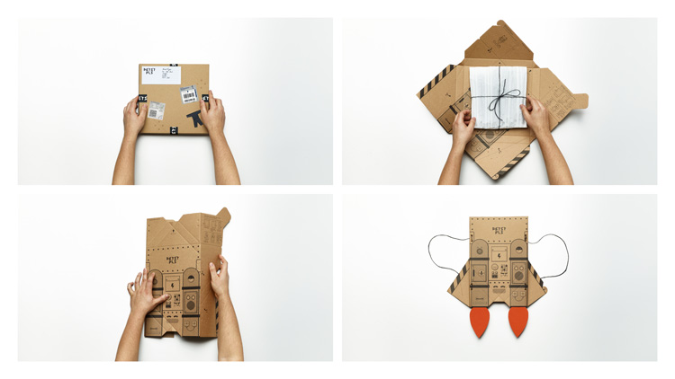 產品盒被設計成“折紙”形狀。皮特曼說,在衣服拆封后,他還會給父母們一些指示,讓他們把衣服重新包裝,變成一個噴氣背包。此舉旨在賦予盒子“新生命”把它變成一個孩子的玩具,發揮可持續發展的理念,擴大產品的使用范圍。