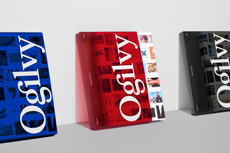 這是一個(gè)新的定制的無(wú)襯線(xiàn)字體,叫做Ogilvy Sans,一個(gè)更新品牌色體系包括深藍(lán)色、灰綠色、粉紅色和灰色。